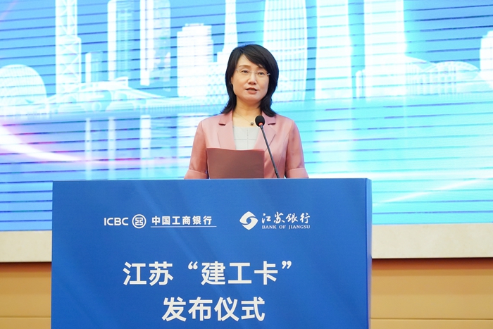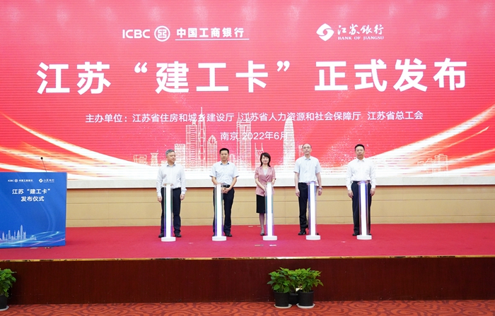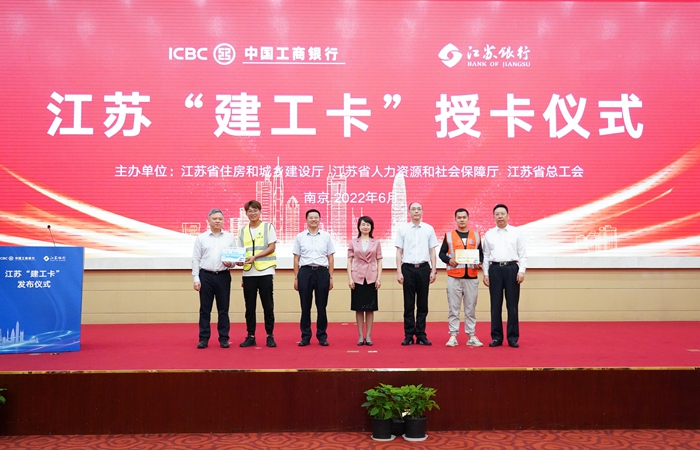 6月17日上午,“江蘇‘建工卡’發(fā)布儀式”在南京舉行。省住房和城鄉(xiāng)建設(shè)廳副廳長王學(xué)鋒、省人力資源和社會保障廳副廳長陳健、省總工會副主席張海濤,中國工商銀行江蘇省分行副行長姜喬、江蘇銀行副行長葛仁余出席發(fā)布儀式并致辭。