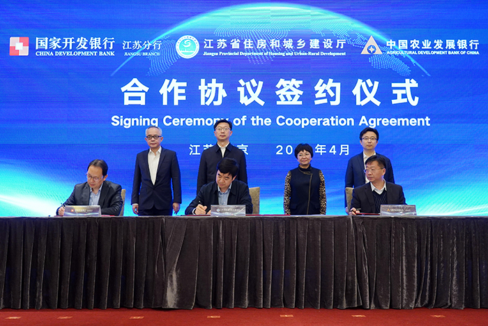 4月19日,江蘇省住房和城鄉(xiāng)建設(shè)廳與 開發(fā)銀行江蘇省分行、中國農(nóng)業(yè)發(fā)展銀行江蘇省分行在寧舉行江蘇省城市更新(老舊小區(qū)改造)政銀合作推進(jìn)會暨框架合作協(xié)議簽約儀式。省政府副秘書長吳永宏,省住房和城鄉(xiāng)建設(shè)廳廳長周嵐、副廳長范信芳, 開發(fā)銀行江蘇省分行行長王衛(wèi)東、副行長田為華,中國農(nóng)業(yè)發(fā)展銀行江蘇省分行行長徐浩、副行長邱振宇出席簽約活動。